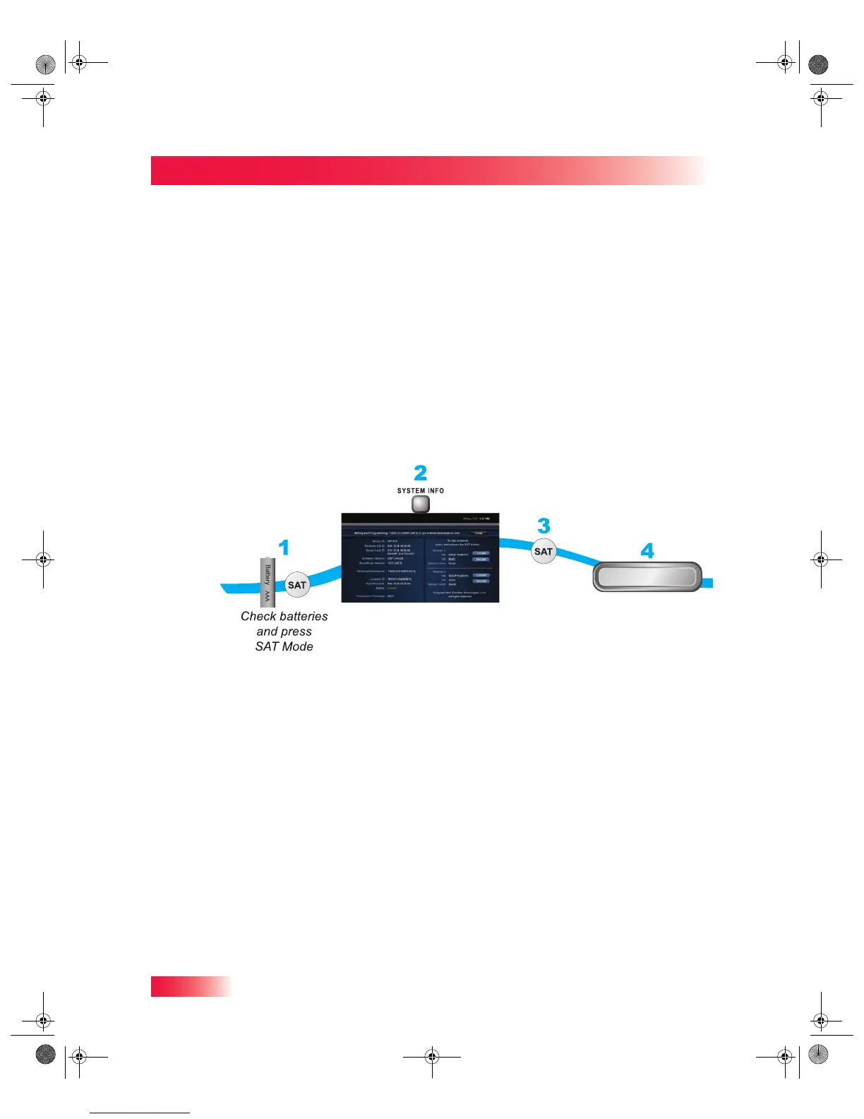 1 Make sure the remote control has fresh batteries installed and is in SAT mode.