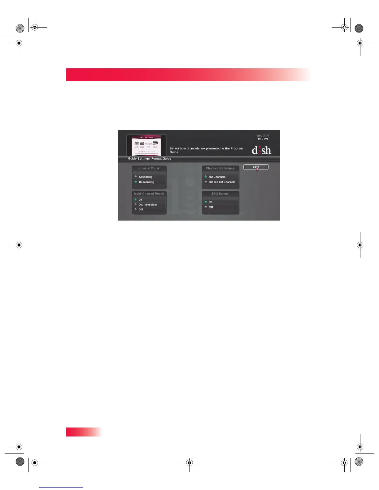 The receiver comes ready to display the Program Guide. However, you can change the