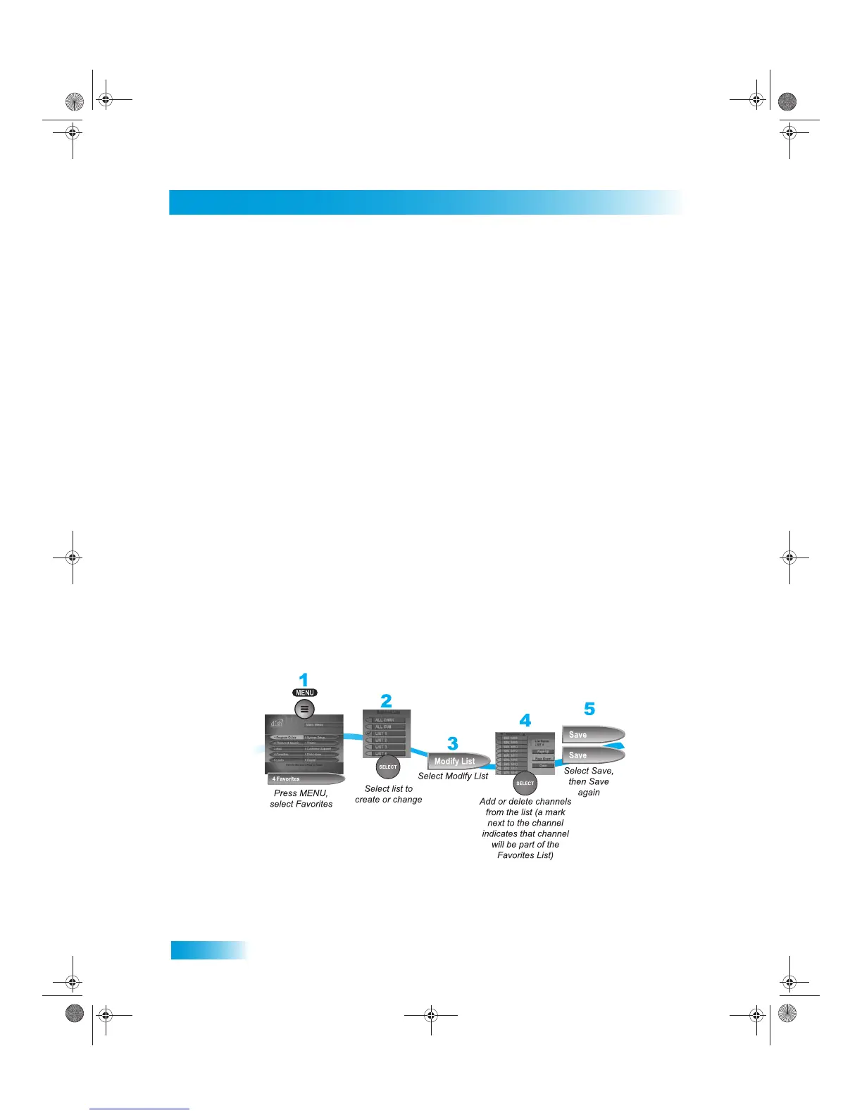 You can create, add channels to, and remove channels from a Favorites List. When you use your