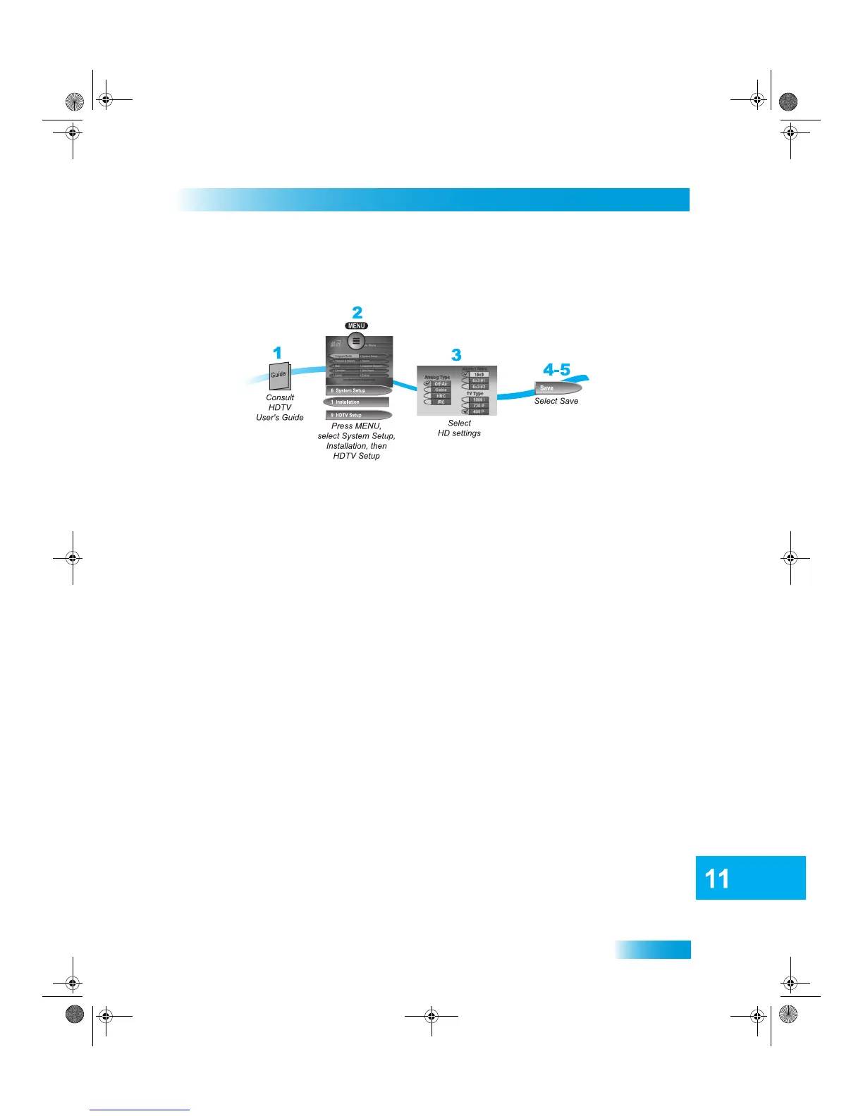 2 Press MENU, select System Setup, Installation, and then HDTV Setup.