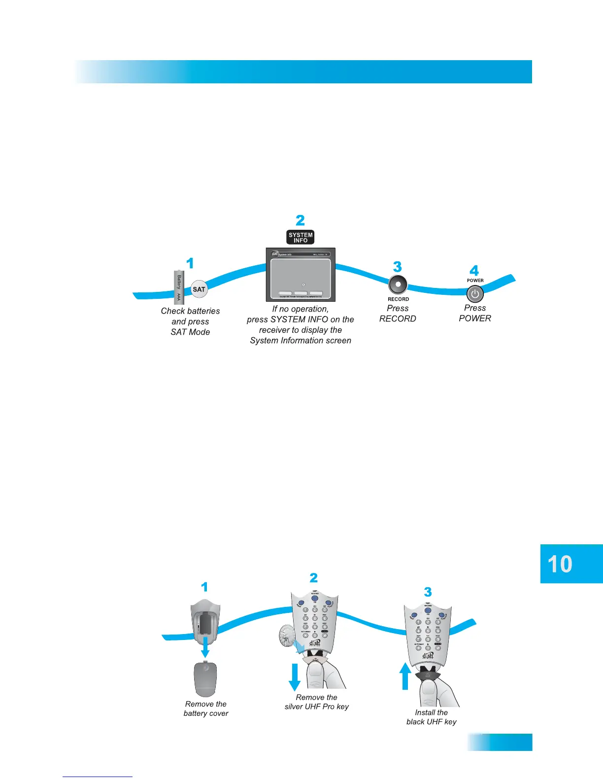 1 Make sure the remote has fresh batteries and is in SAT mode.