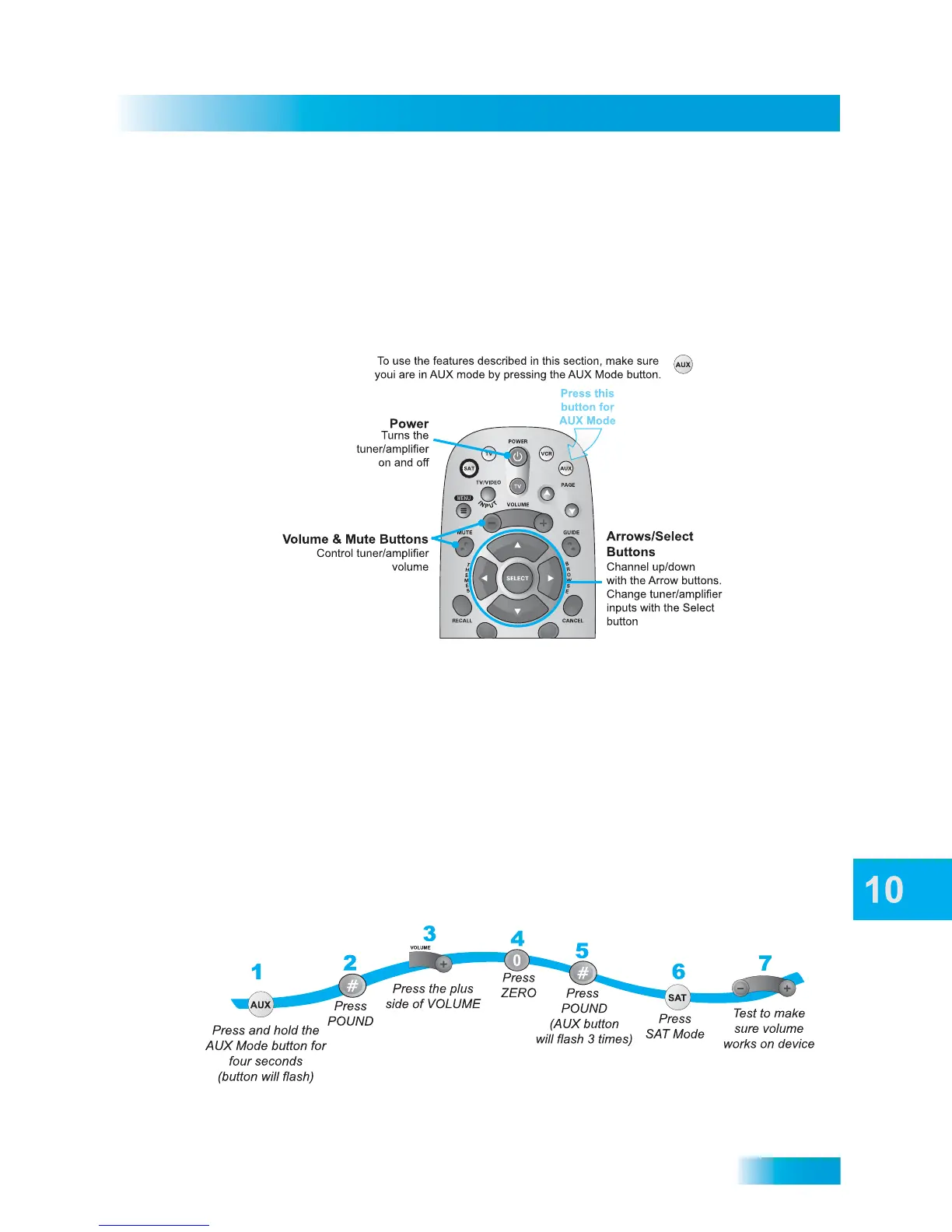 Note: You must first program the tuner or amplifier into the AUX mode of the remote