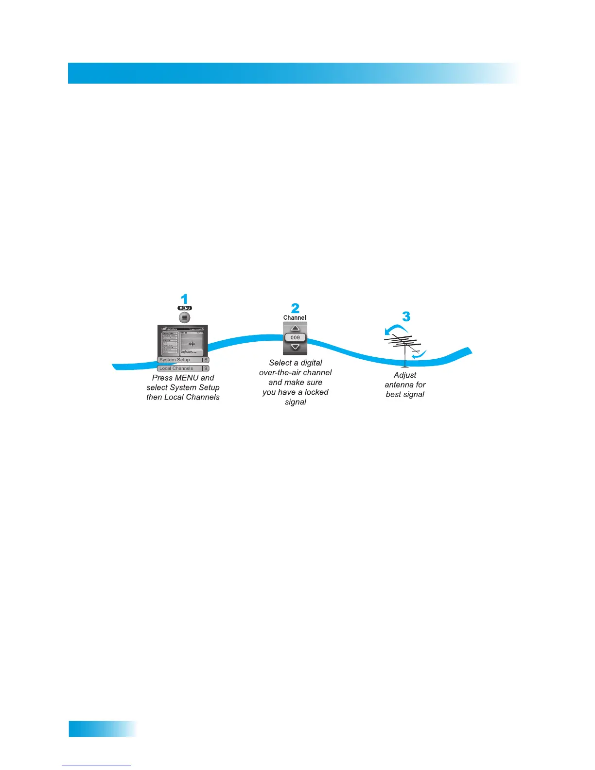 1 Make sure that you have your over-the-air antenna properly connected to the receiver’s 8VSB TV/