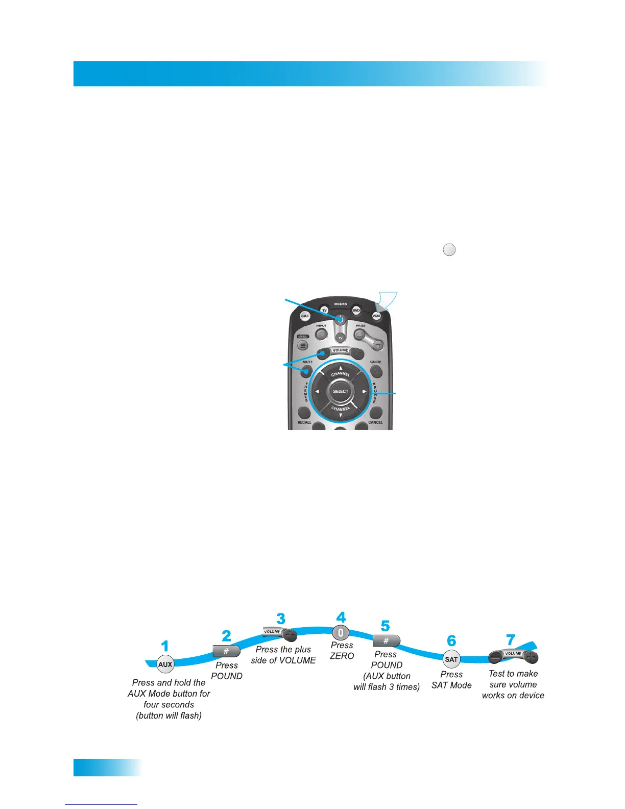 remote to AUX mode. The AUX mode button will stay lit for two seconds to show you’ve