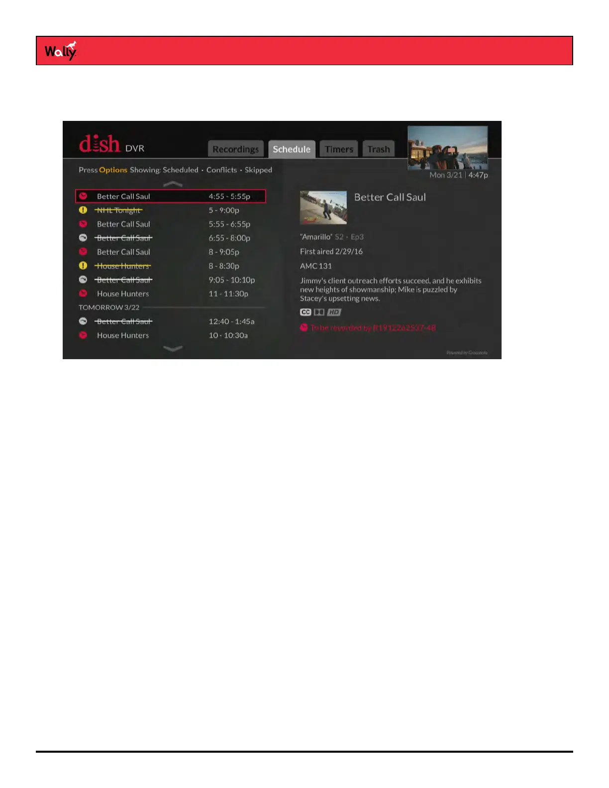 Press the DVR button on the remote and select the Schedule tab to view it. Selecting a program gives you the
