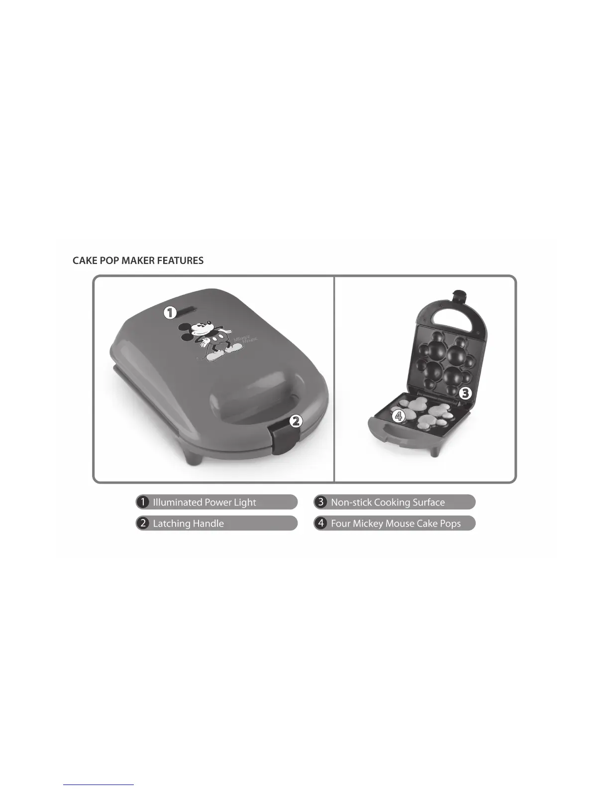 Disney DCM-8 - Cake Pop Maker Features; Illuminated Power Light; Latching Handle; Non-stick Cooking Surface