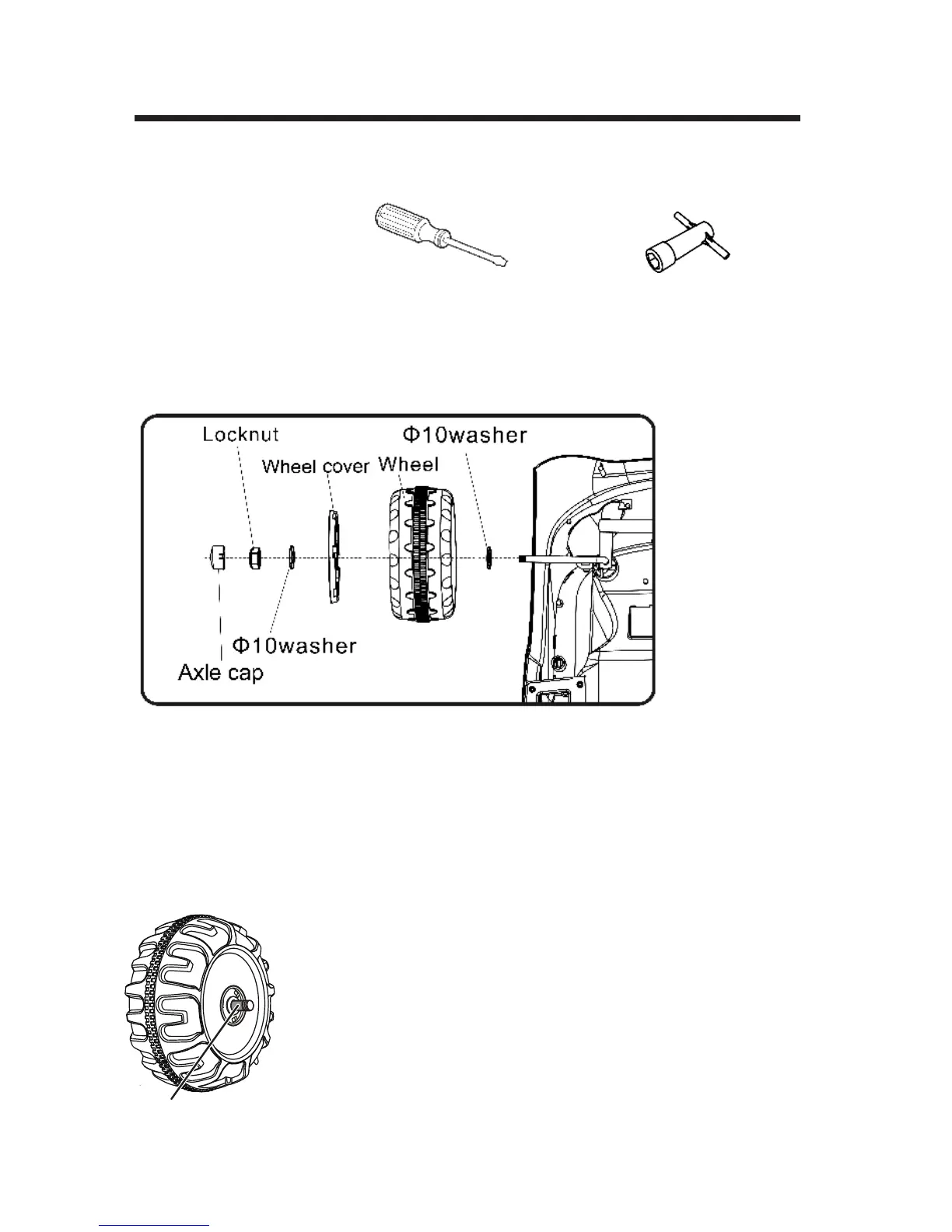 Remount the Ø10 washer, M10 locknut and securely tighten the wheel; then