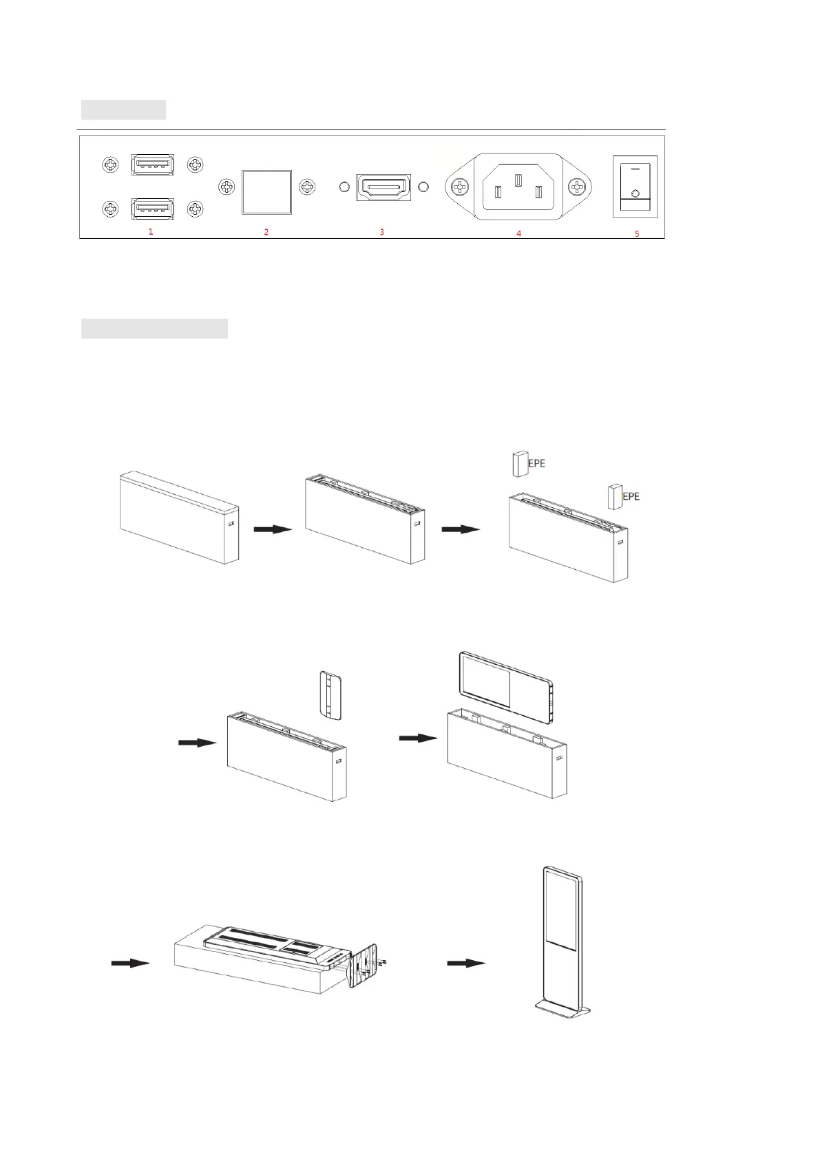 1. USB interface; 2. RJ45 interface(Ethernet); 3.HDMI input; 4.Power port; 5. On/Off button;