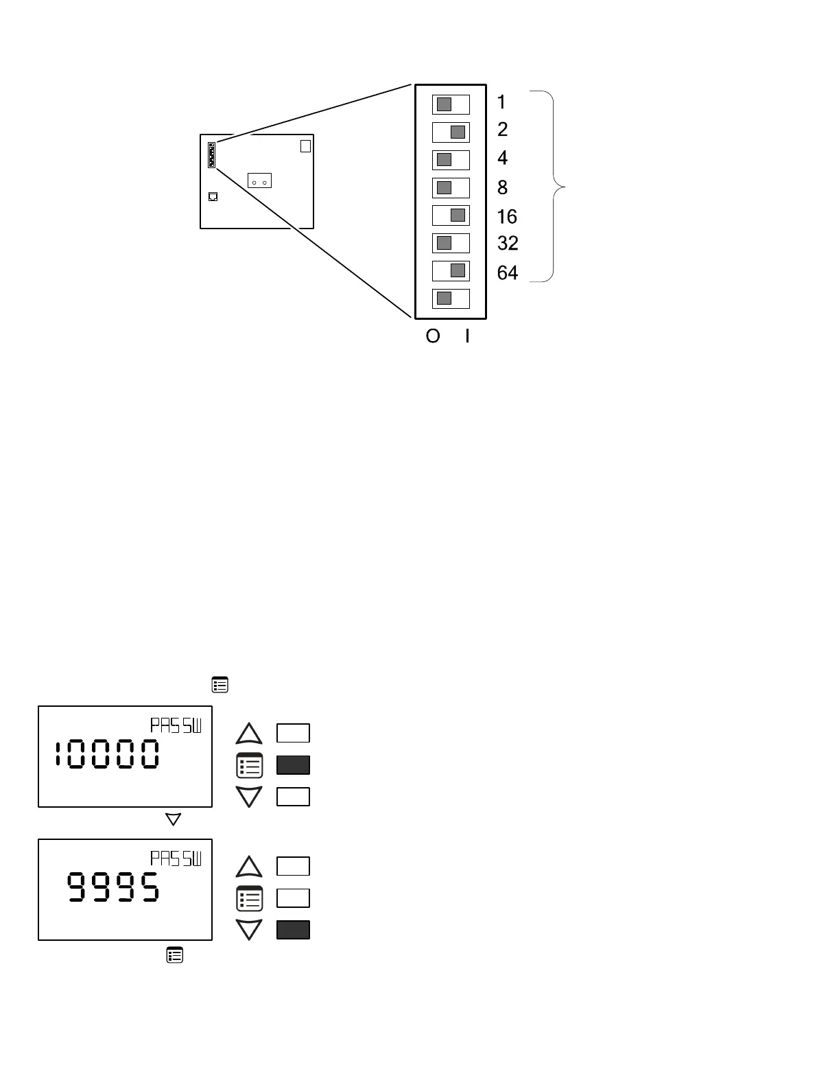 The address is the sum of the numbers set to ON. For example, if the second (2), fifth (16), and seventh (64) DIP switches are set to ON, the device