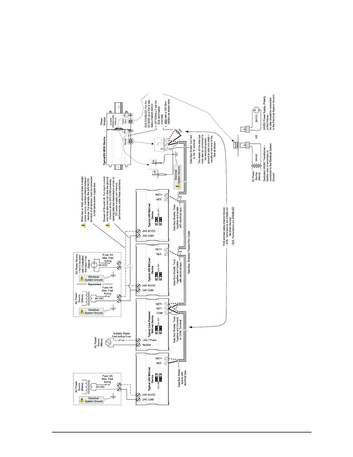 An overview of the BACnet MS/TP LAN and power wiring is shown below.