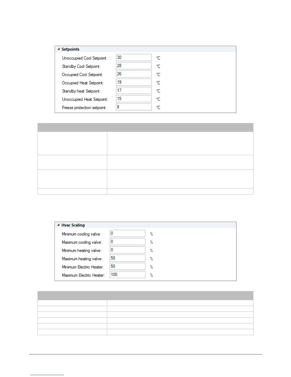 subsection contains the heating and cooling setpoints for the occupied,