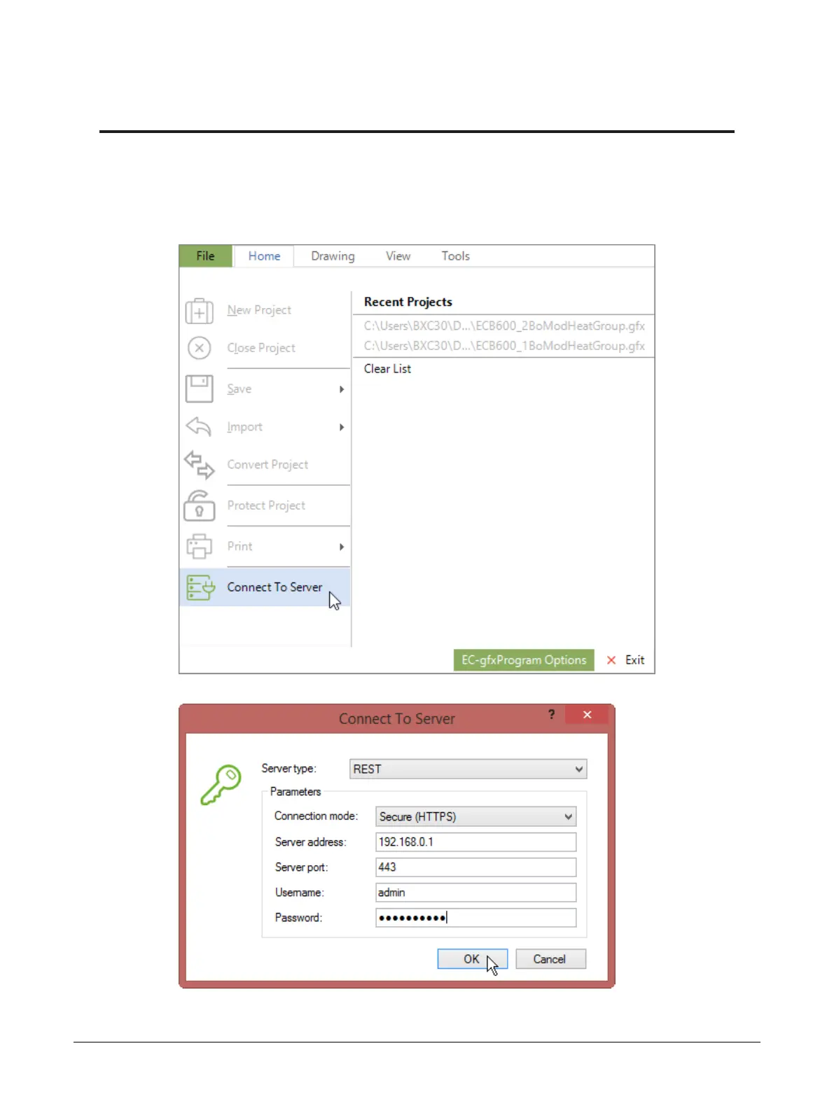 1. Launch EC-gfxProgram. From the file menu connect to server.