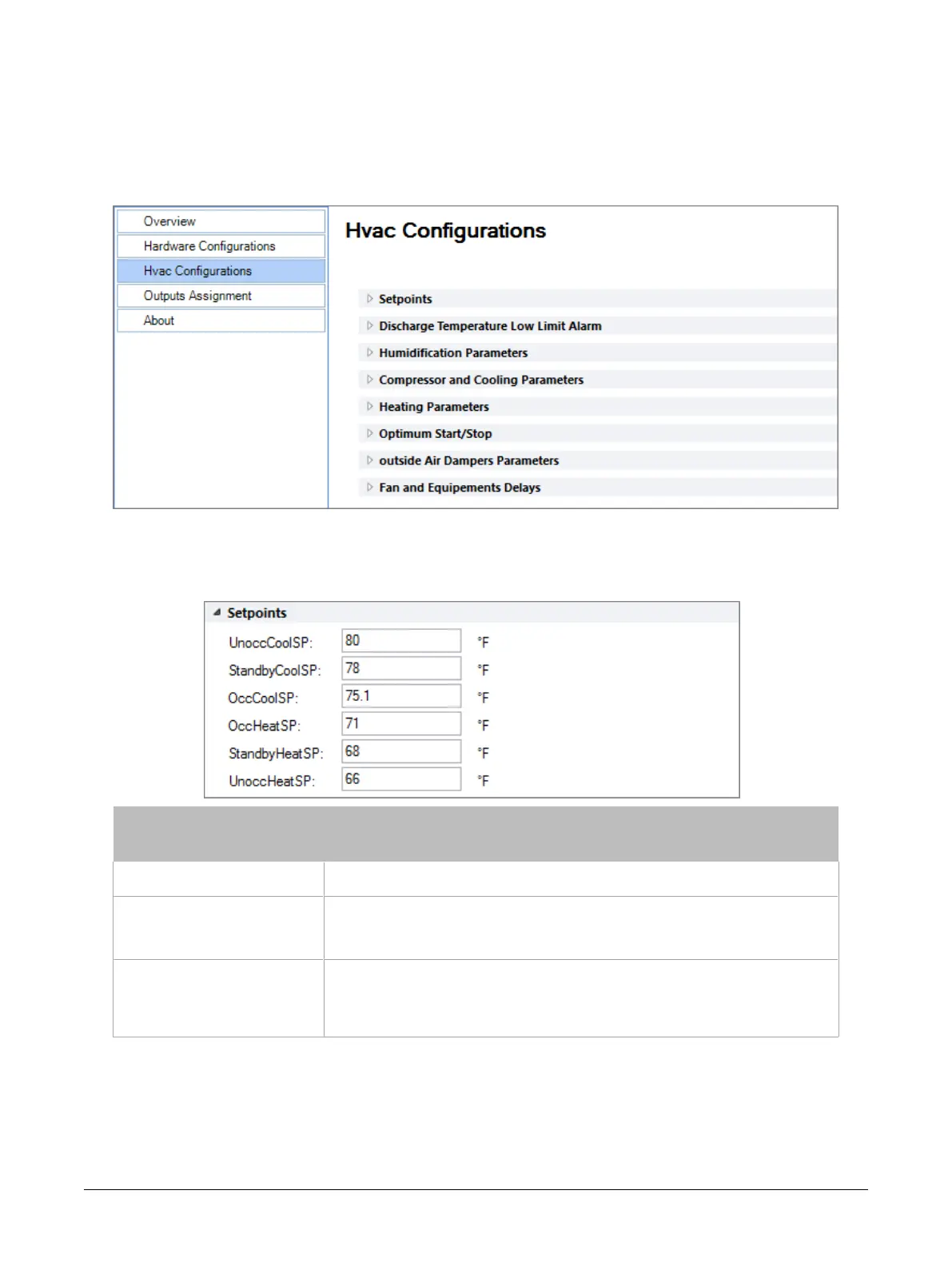 standby and unoccupied modes. The table below gives a brief description of each type of setpoint.