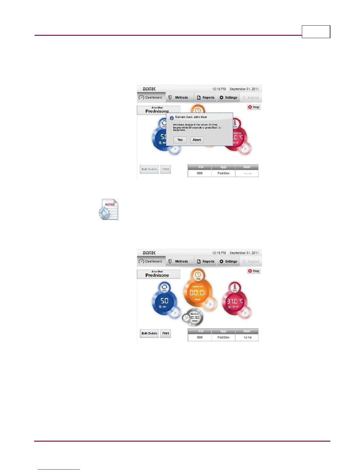 5 Another dialog window prompts the operator to introduce the dosages while the stirring is
