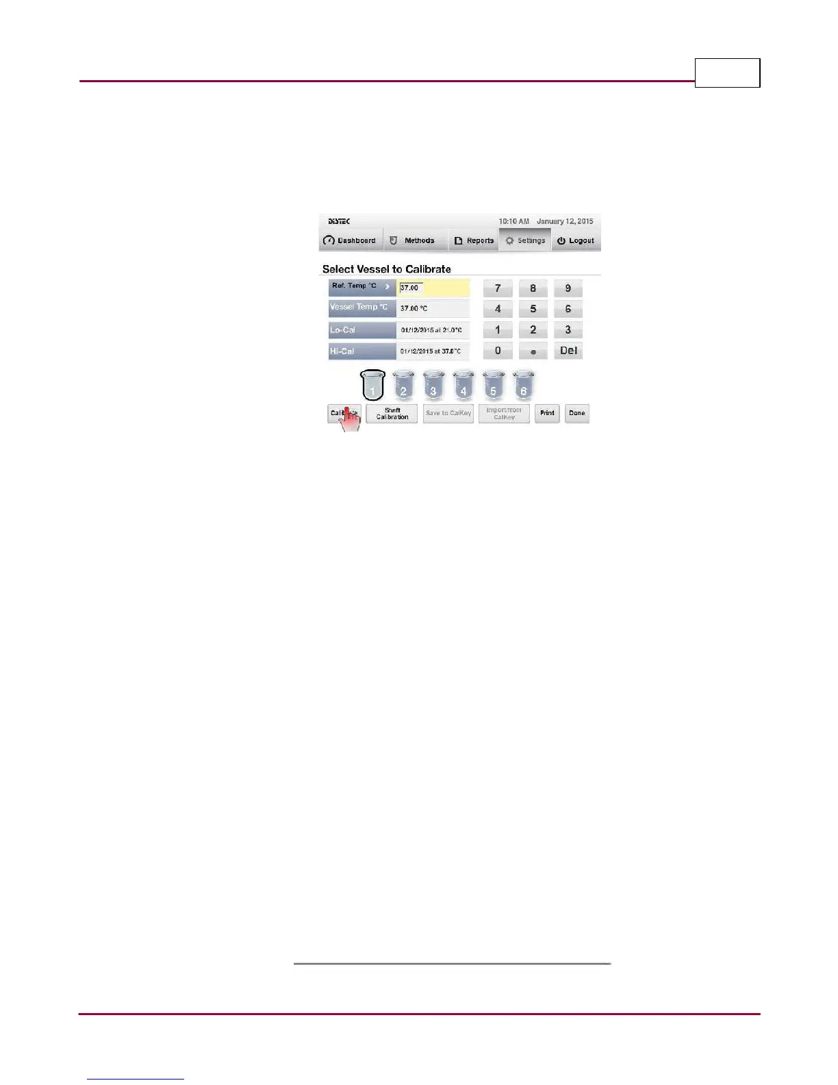 6 Once satisfied with the result, continue the calibration by selecting vessel position 2 and