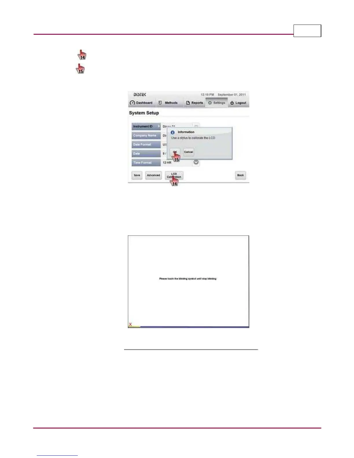 A popup window message prompts user to use a stylus to calibrate the LCD. Select