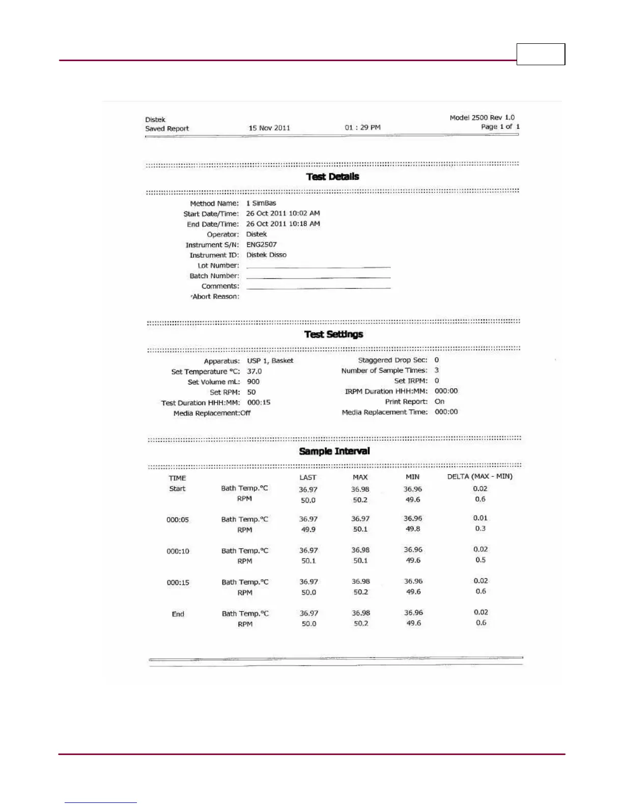 Saved Report printout generated after a method test is completed: