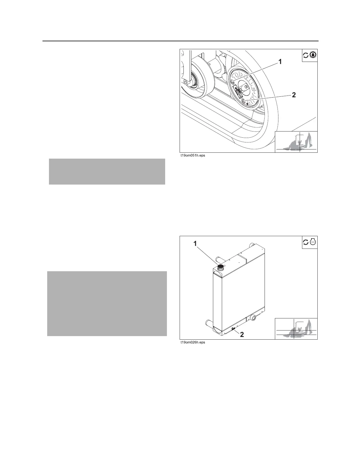 2. Remove plugs (1, 2) and drain oil.