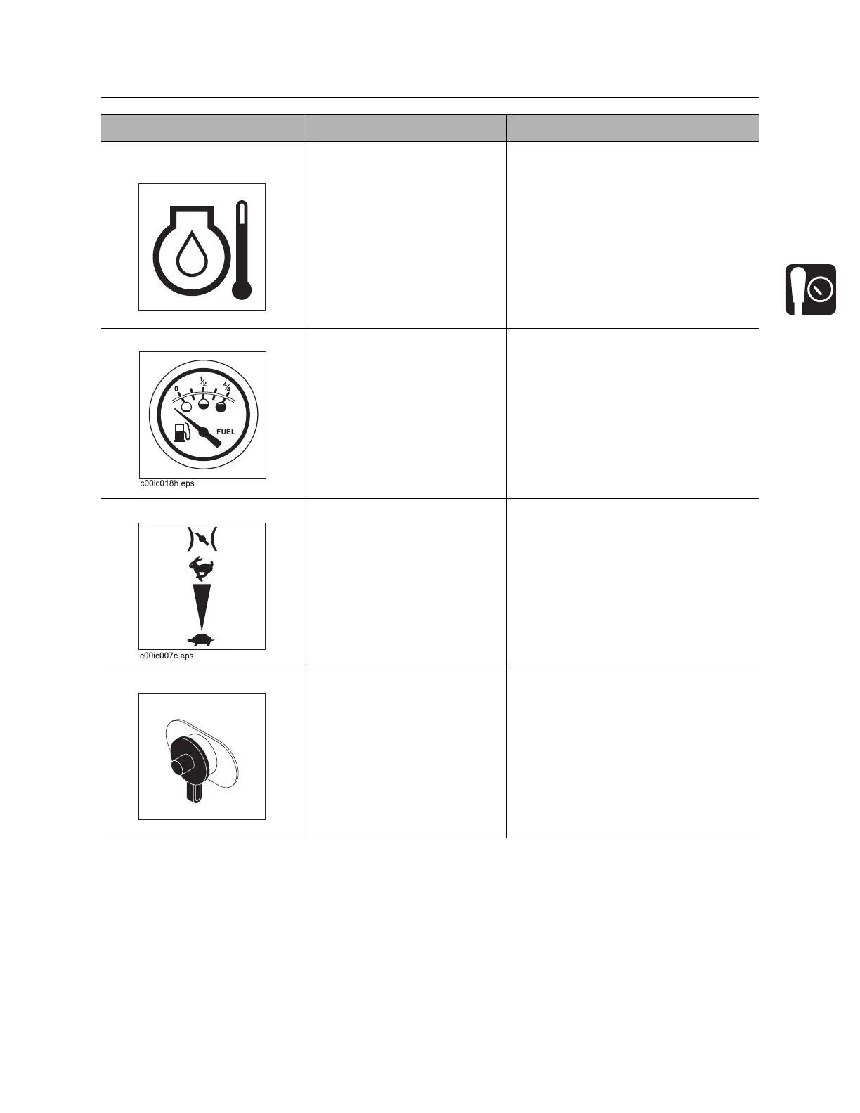 11. Fuel gauge Displays fuel level in tank. Use no. 2 diesel fuel. See page 80 for