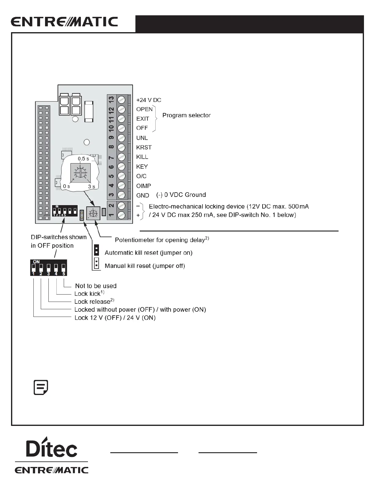 If the switch is set to ON, the LOCK RELEASE is active during the opening delay time set by the potentiometer. For