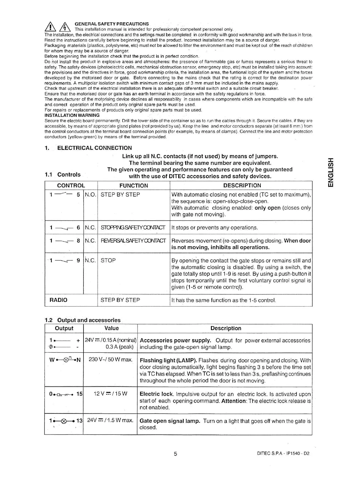 DITEC Silver 1B/40B - Electrical System Controls; Controls; Output and Accessories