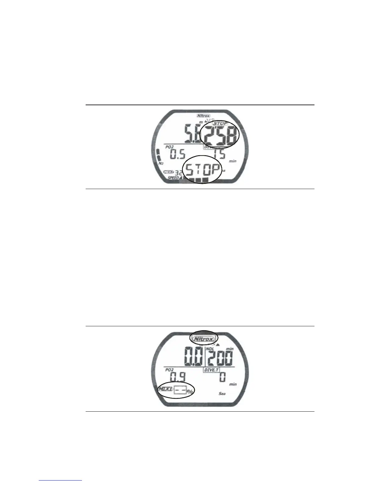 Default warning indicated by Nitrox flashing and a dashed line for