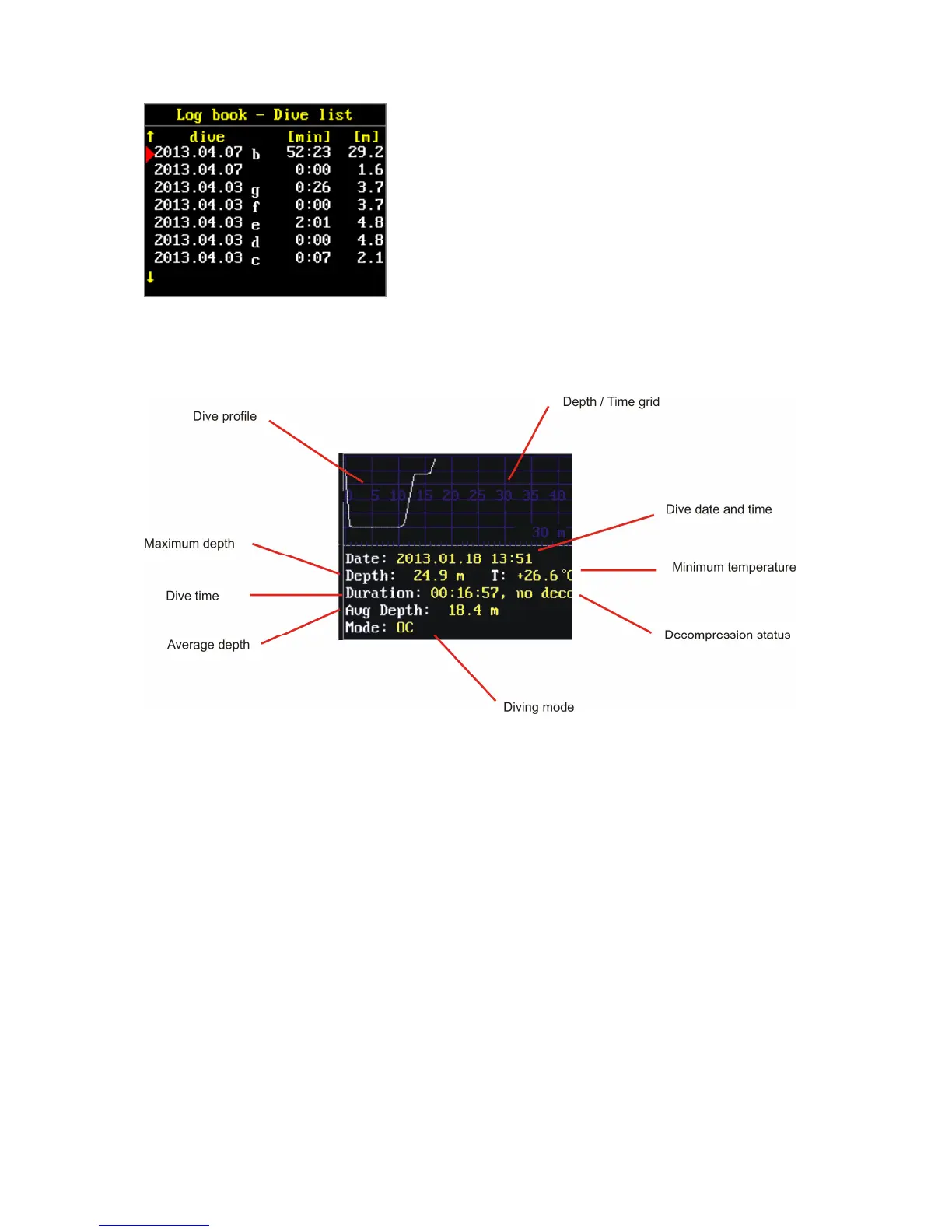 Select the desired dive and open it with KEY 1. Each dive includes a graph of the diving profile, date