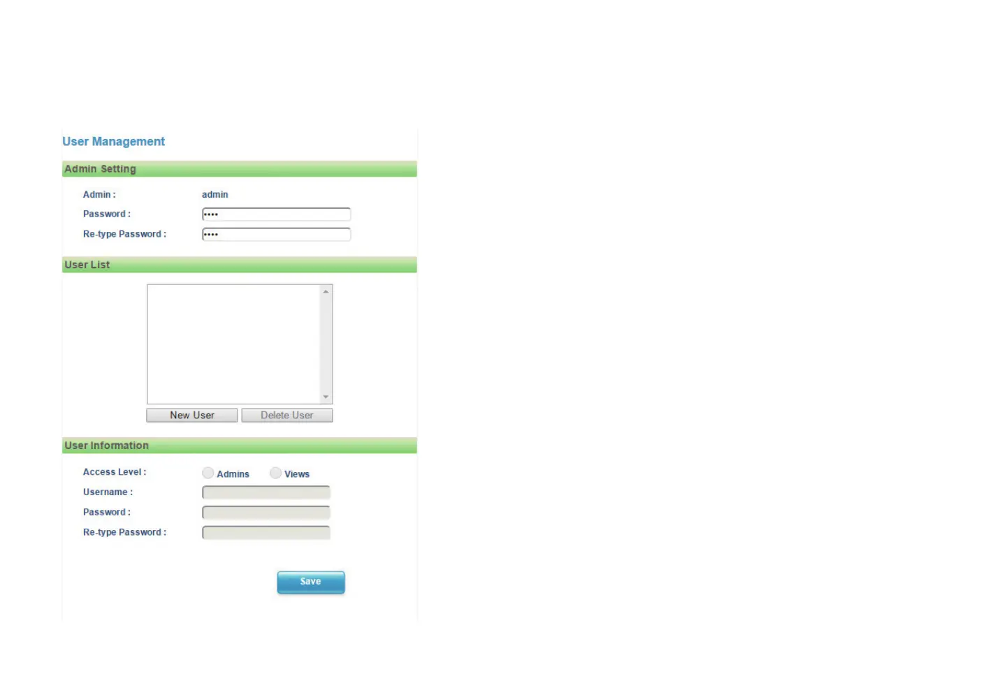 Press New User to add a new account and set up the authorization level of
