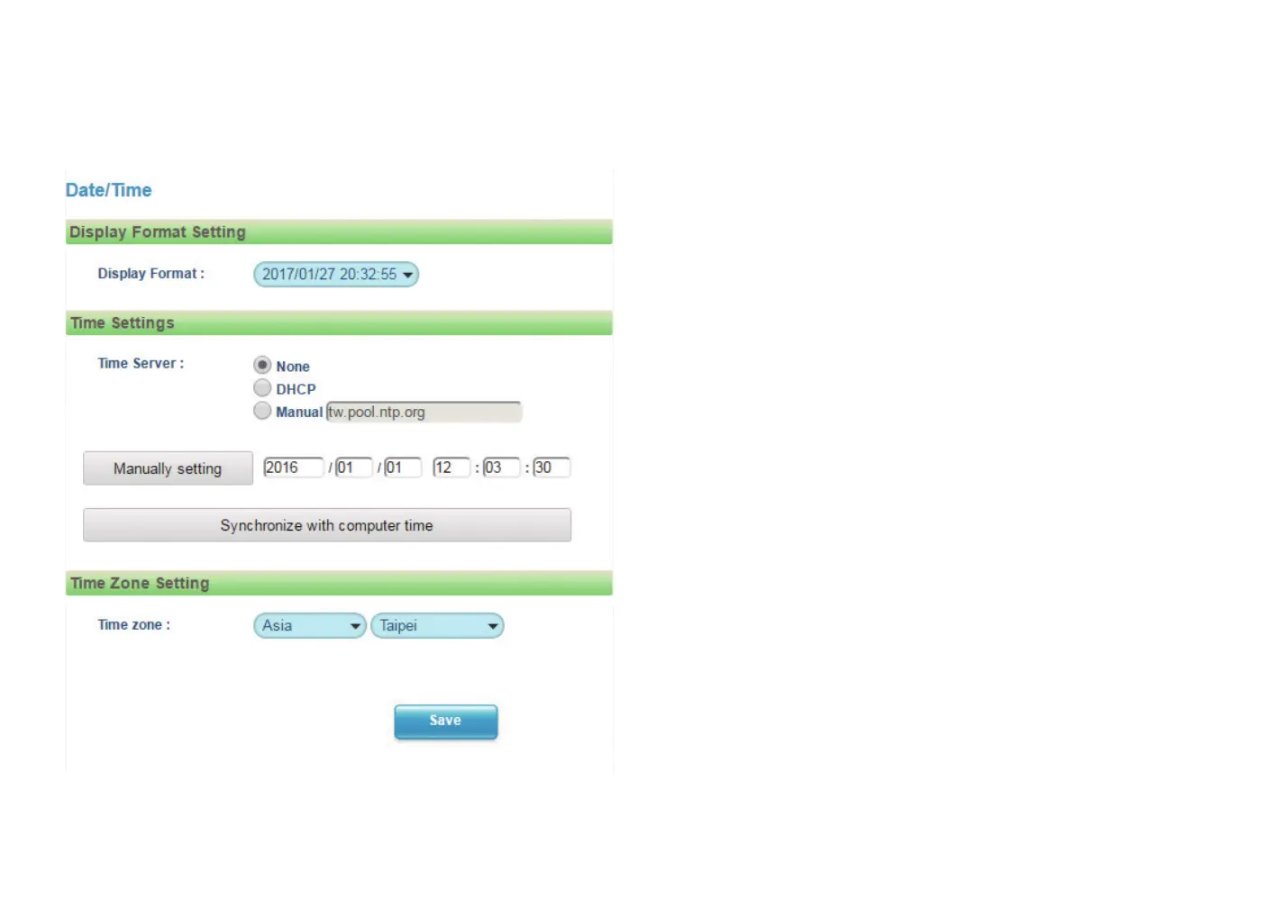 Manual: Select this option to configure the NTP server address manually for