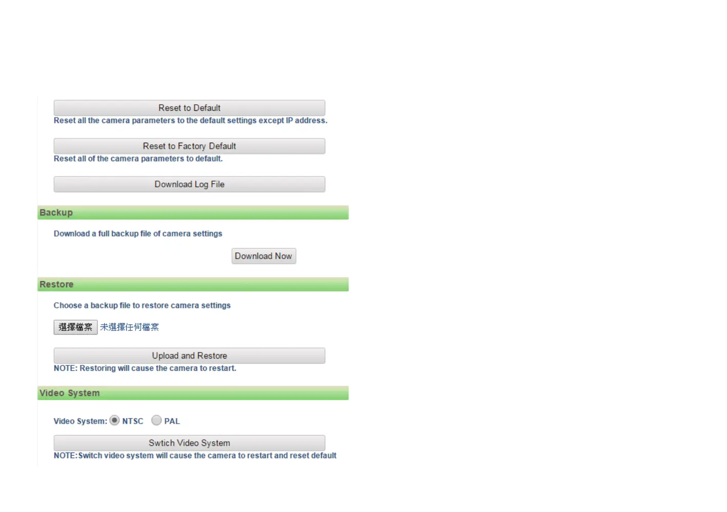 Options to switch between NTSC or PAL video system. The camera will