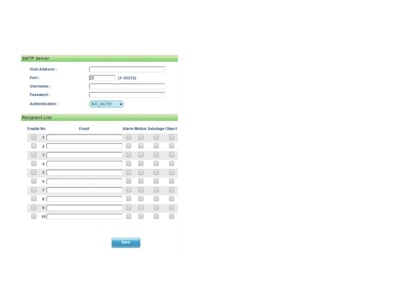 Alarm, Motion, Sabotage or Object. A maximum of 10 email addresses