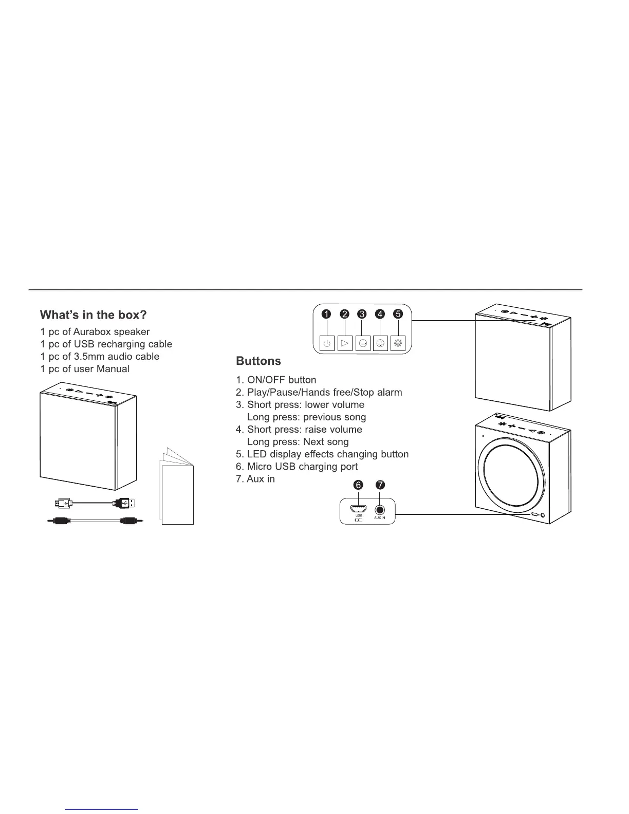 Divoom Aurabox - AuraBox Package Contents and Controls; Items Included in the Box; AuraBox Device Buttons