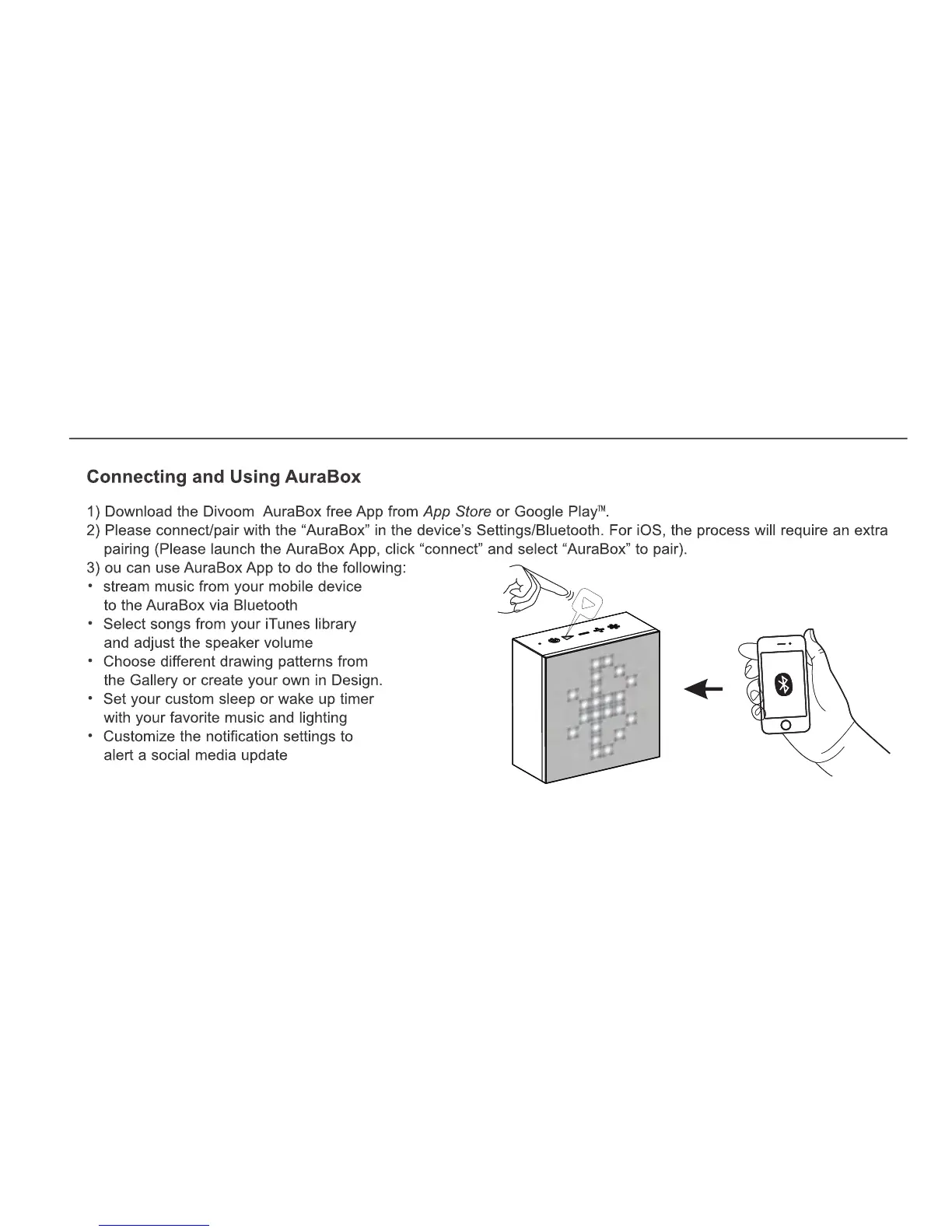 Divoom Aurabox - Connecting and Using the AuraBox; Bluetooth Pairing and App Setup; AuraBox App Functionality Guide