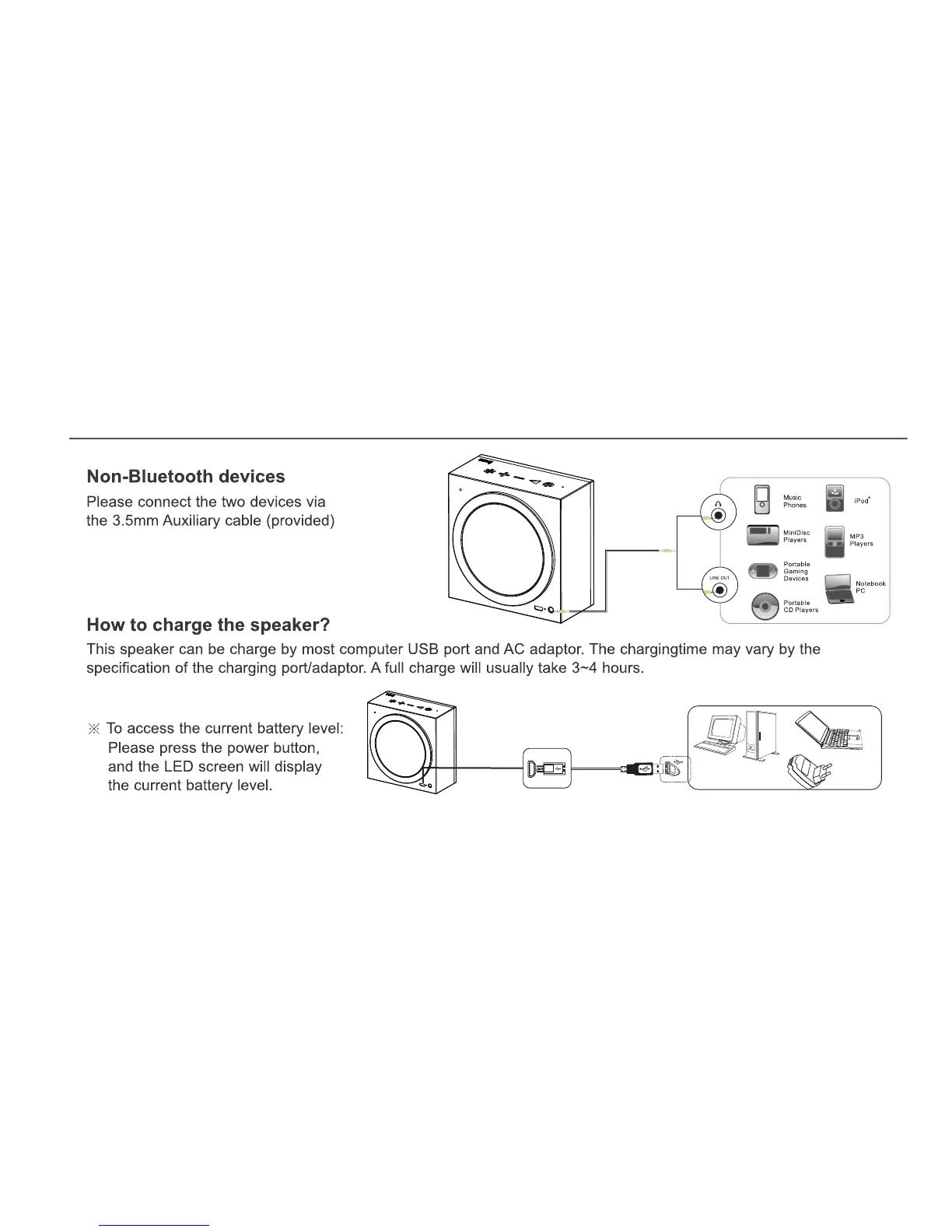 Divoom Aurabox - Audio Connectivity and Power Management; Connecting Non-Bluetooth Audio Sources; Charging the AuraBox and Checking Battery Level