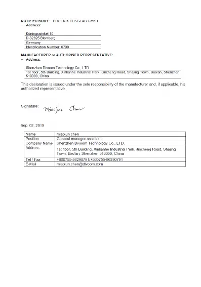 Divoom Ditoo - Manufacturer and Notified Body; Manufacturer and Representative