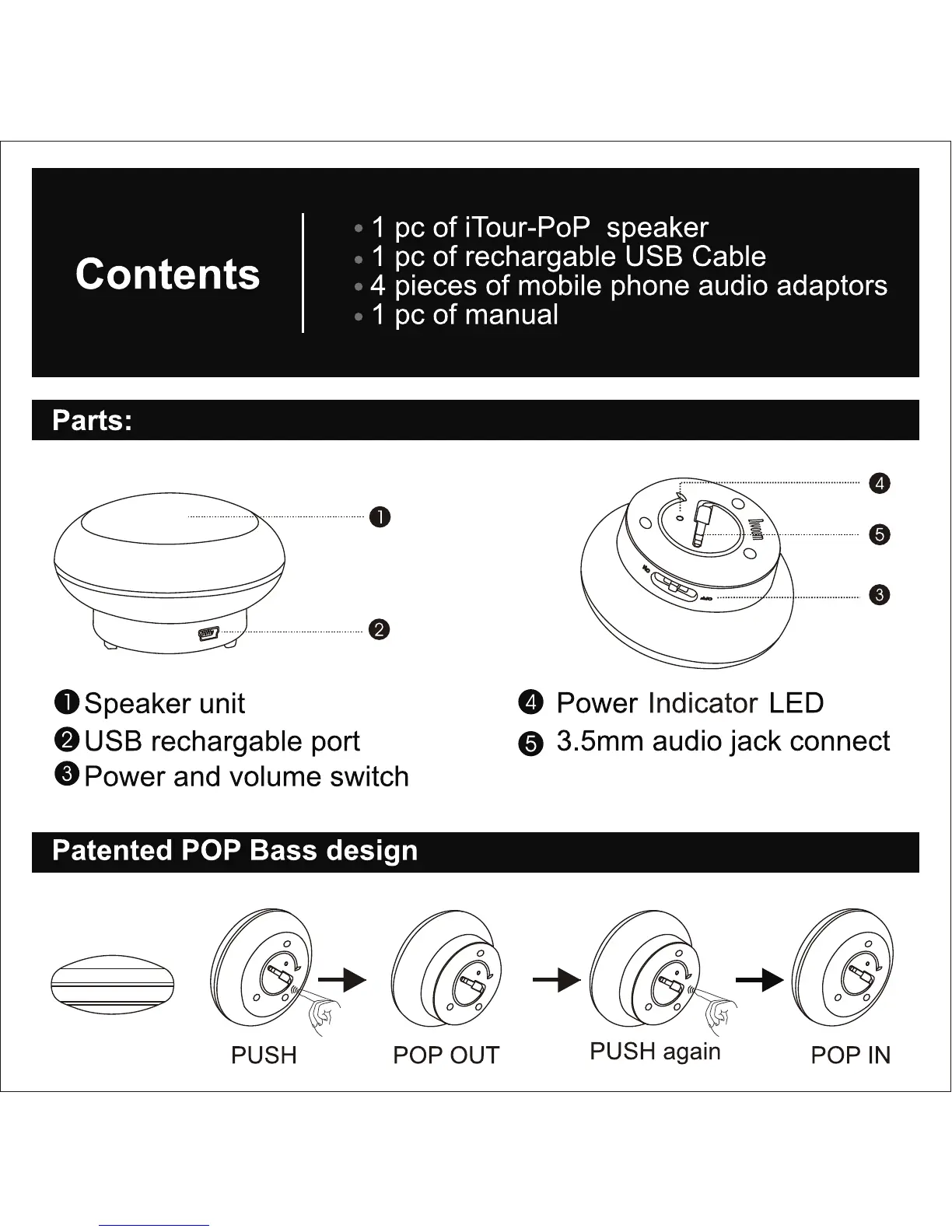Divoom itour-pop - Contents; Parts; Patented POP Bass Design
