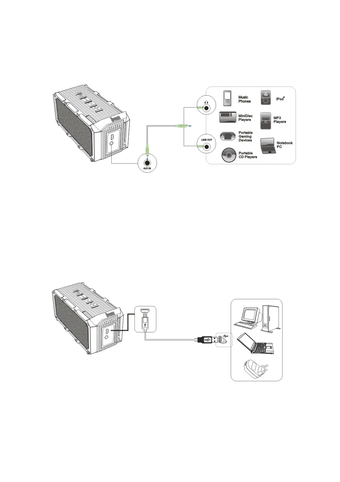1. Insert one end of 3.5mm audio connector into the “Aux- in” jack of Voombox-ongo