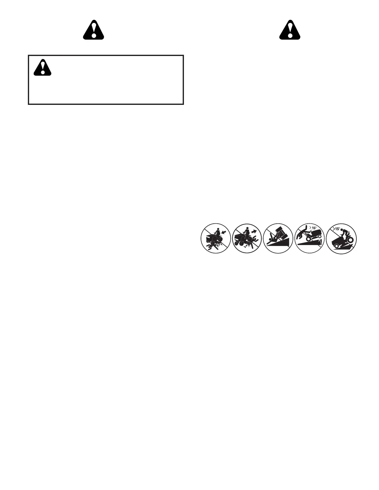 • Avoid starting, stopping, or turning on a slope. If the tires