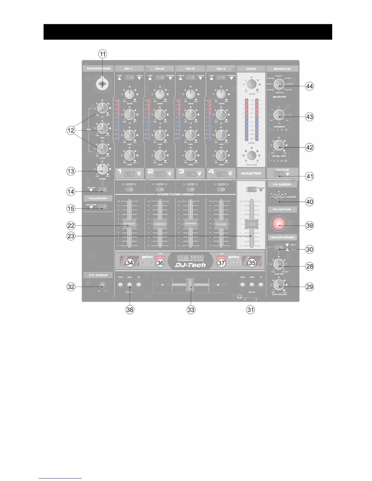 15. Talkover-Ein-/Ausschalter. Mit diesem Schalter wird der Master-Musiksignalpegel gesenkt, sodass