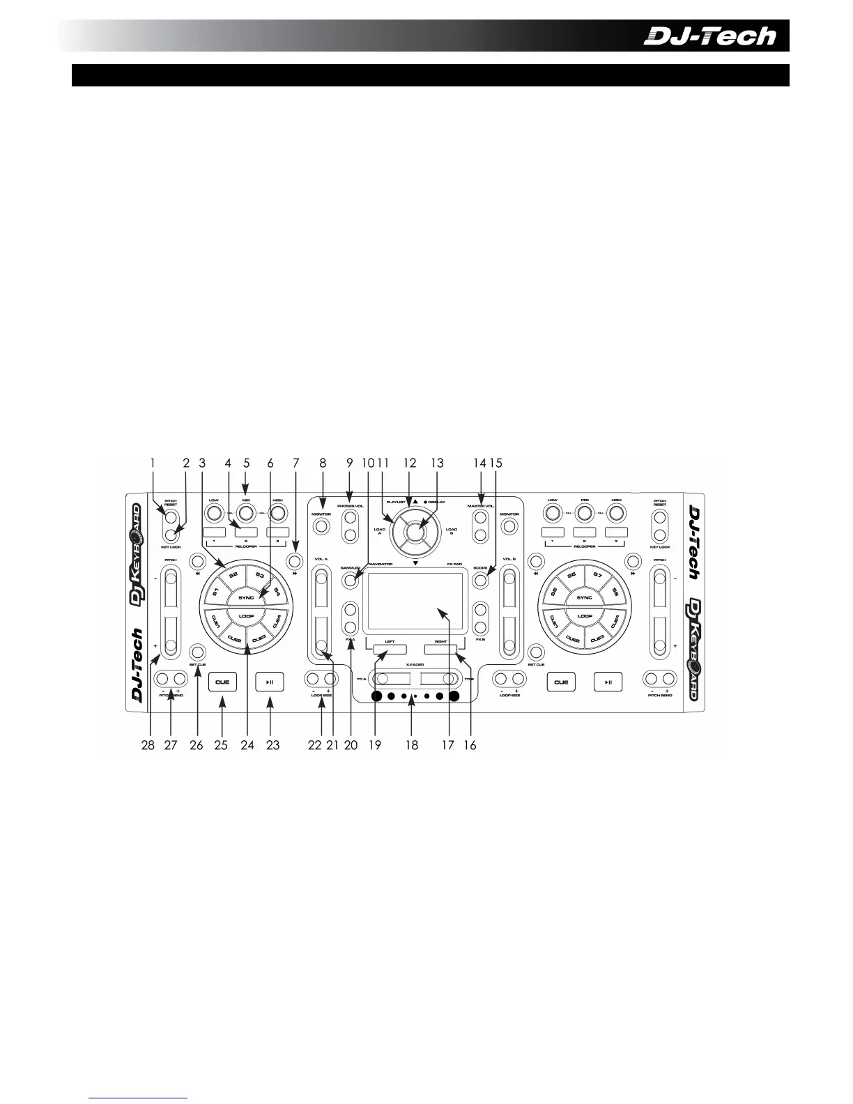 18. CROSSFADER – Pulse este botón para controlar el crossfader.