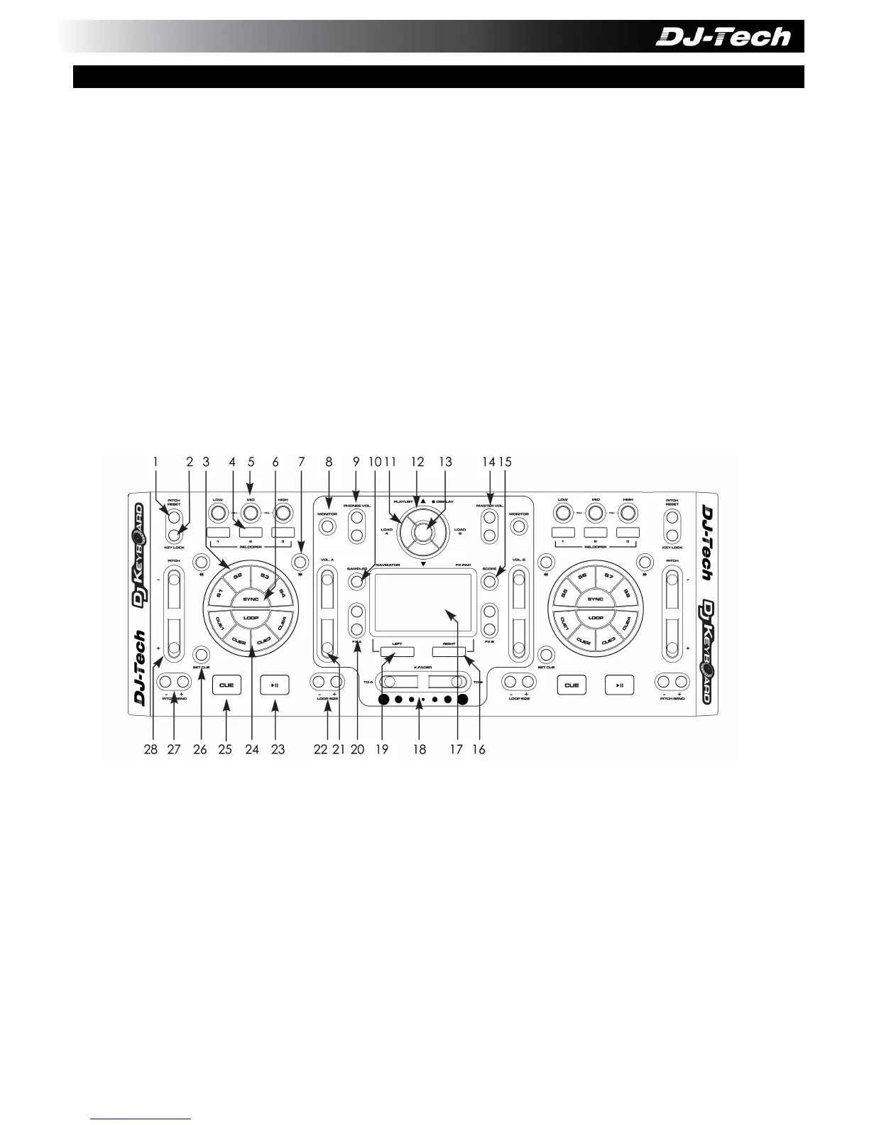 26. CUE IN – Premere questo tasto e i tasti HOT CUE per impostare l’Hot Cue.