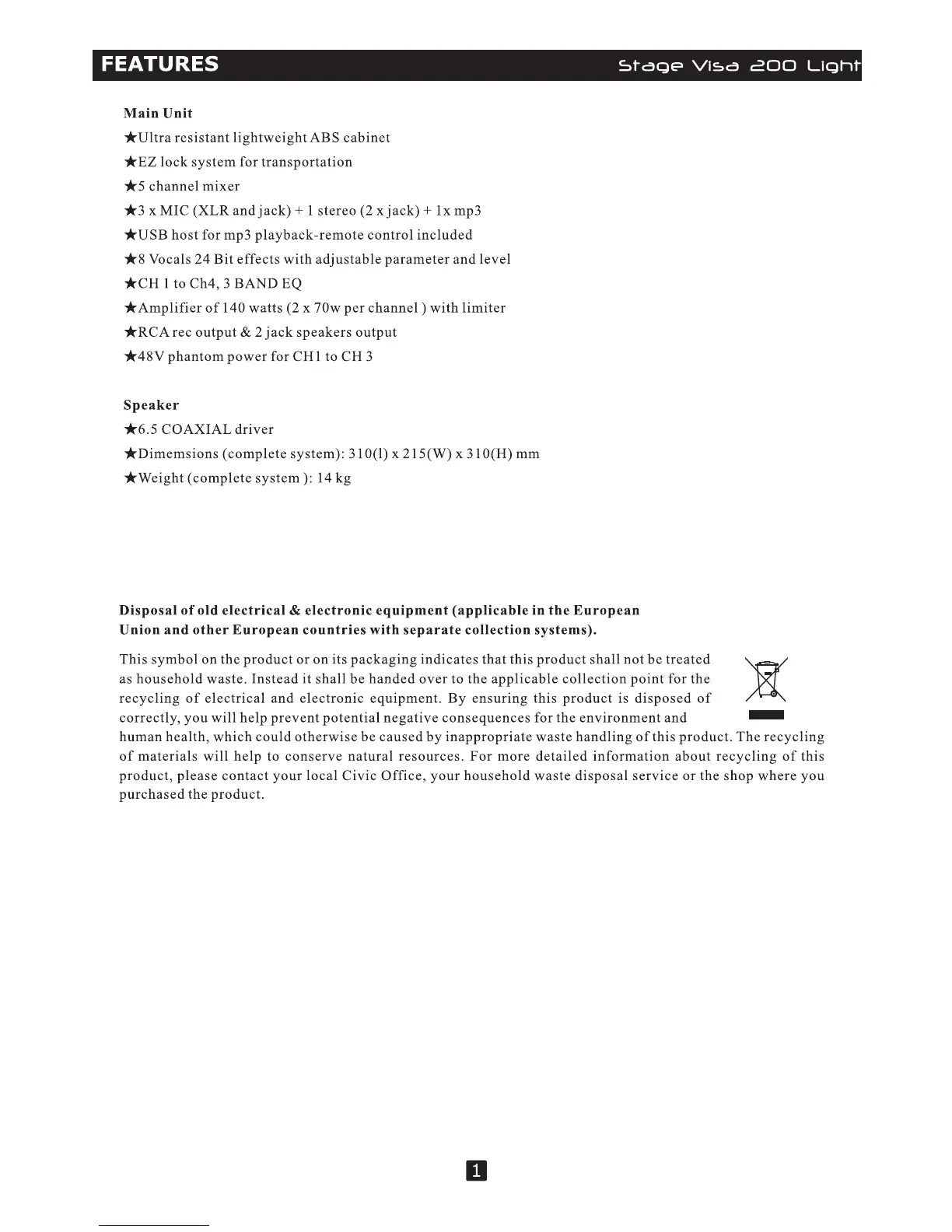 DJ-Tech Stage Visa 200 light - Product Features Overview; Main Unit Features; Speaker Specifications