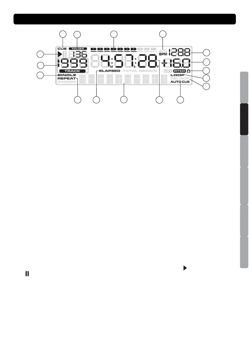 17. INDICATEUR PLAY/PAUSE – Indique que l’appareil est en mode lecture (" "), ou en mode pause