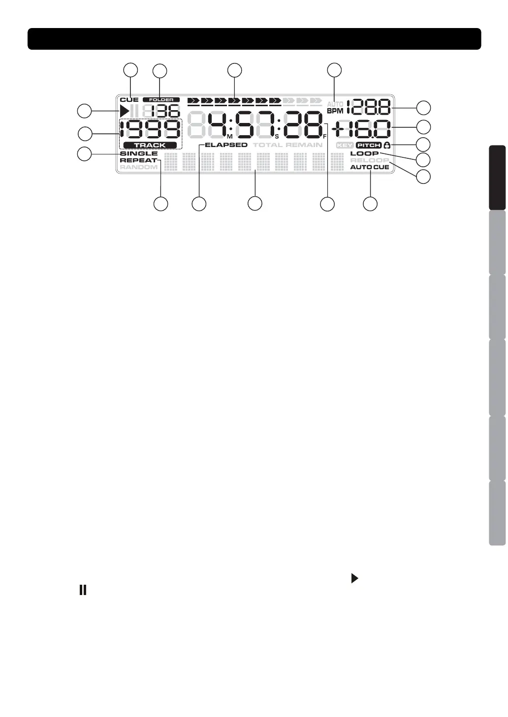 15. SINGLE INDICATOR – Indicates whether the play mode is set to single ("SINGLE") or continuous