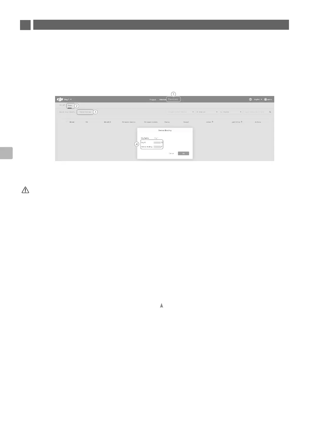 DJI. Clique para criar uma organização, preencha as informações da organização e clique no nome da