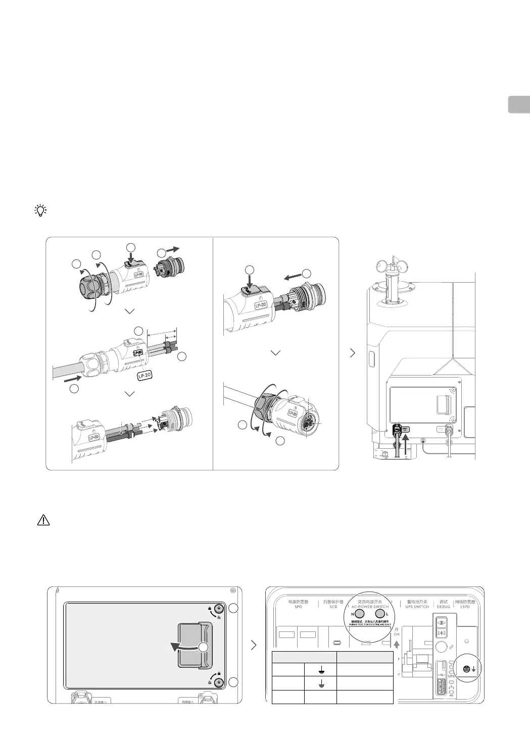 e. 先轉緊尾部套筒,再轉緊尾部螺帽。檢查電源線表層絕緣層完全被尾部螺帽覆蓋,避免影響防水性能。