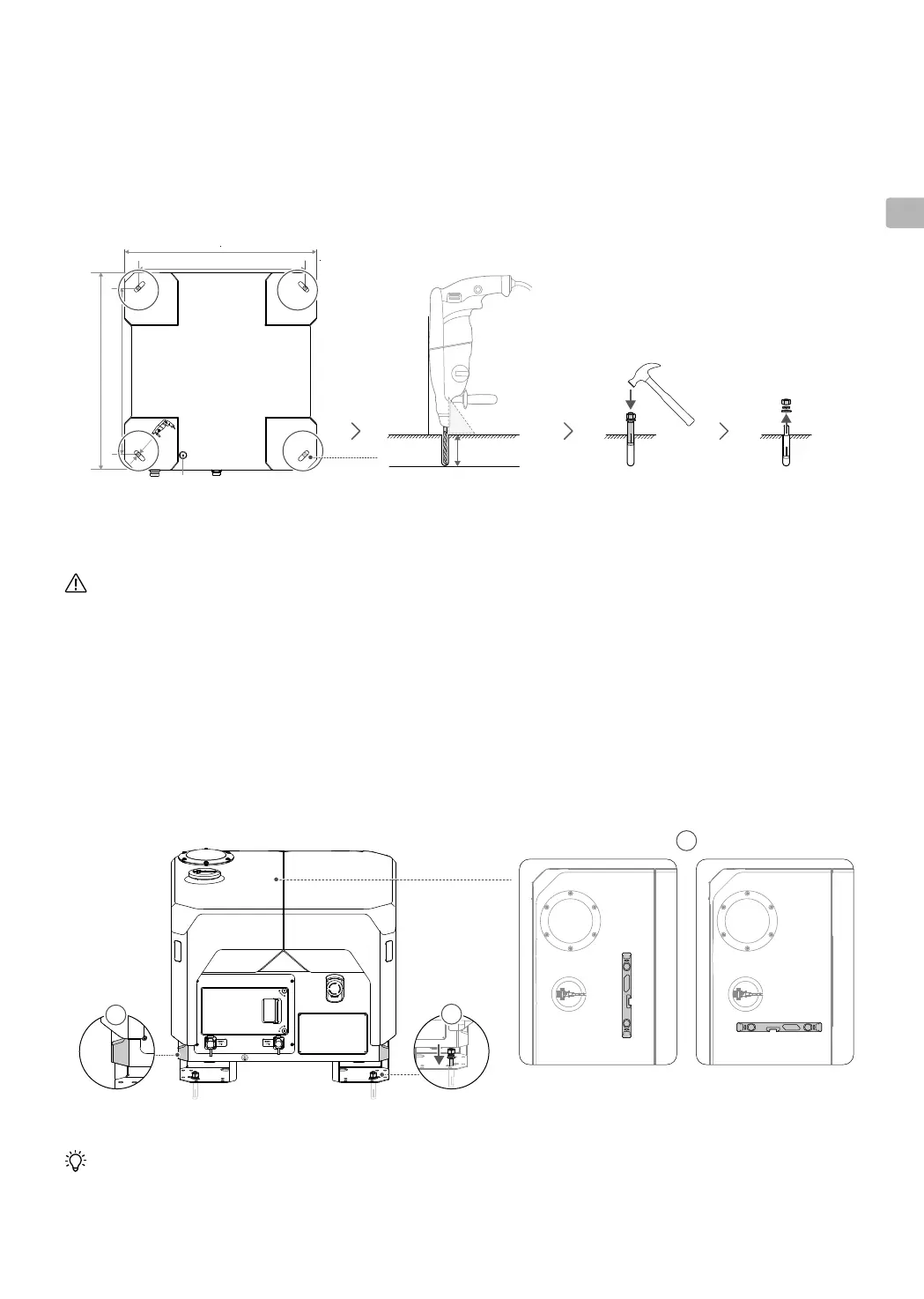 2. ハンマードリル(ドリル直径Ф12 mm)と取り付け穴の印との位置を合わせ、ハンマードリルを地面に対して