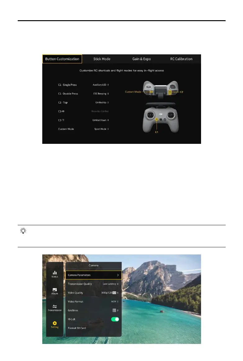 include the C1 button, C2 switch, and the custom mode on the ight mode switch. The stick mode can be set