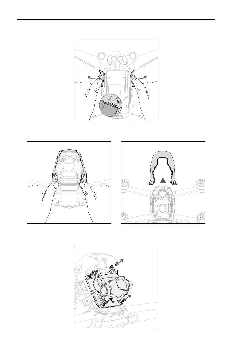 4. Facing the aircraft, hold the front frame arm and push in the direction shown to remove the top shell.