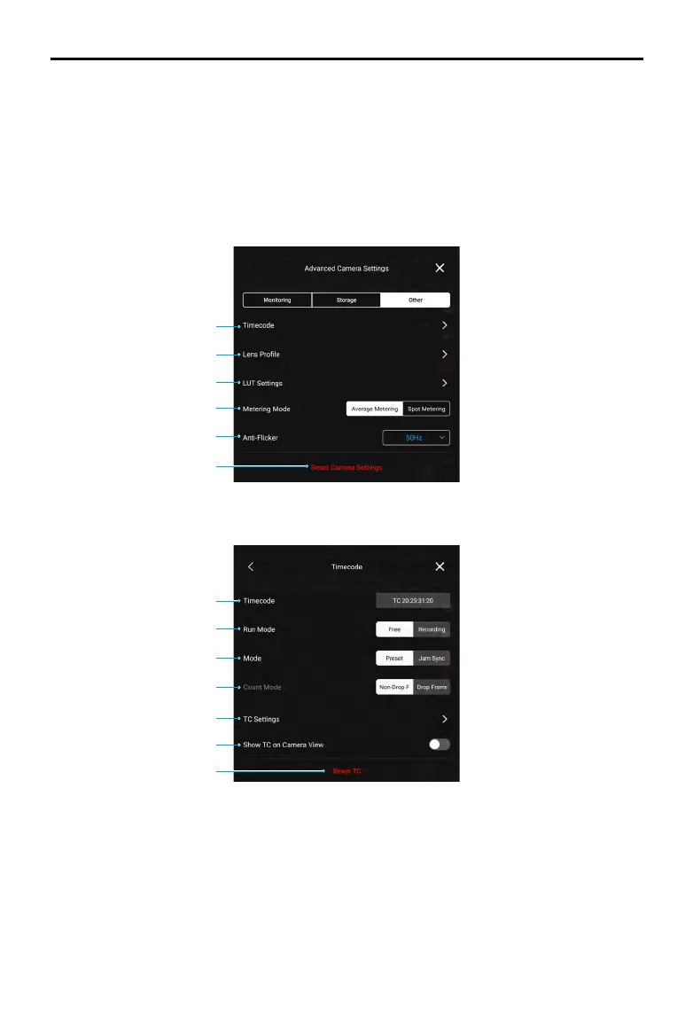 Tap to set timecode, lens, LUT, metering mode, and anti-icker.